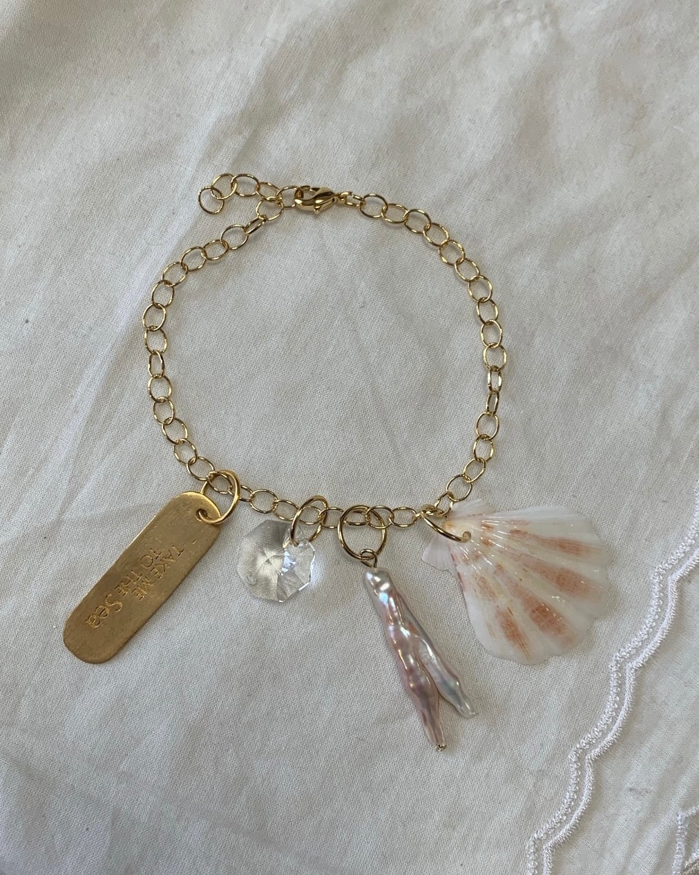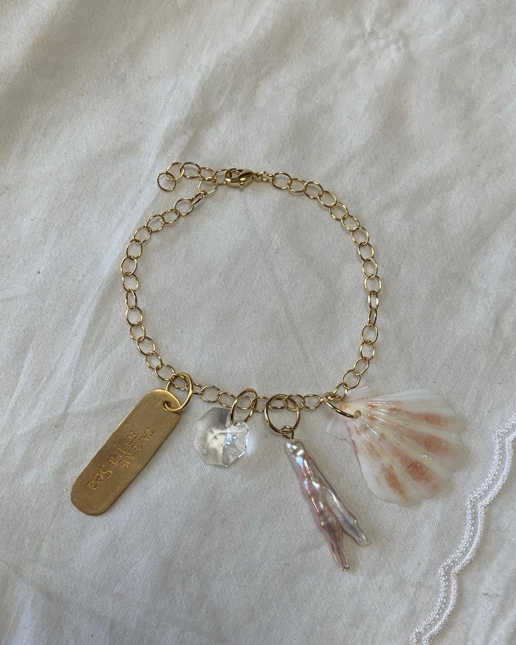 A one-of-a-kind keychain crafted from seashells, beads, pearls,