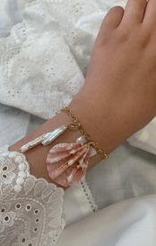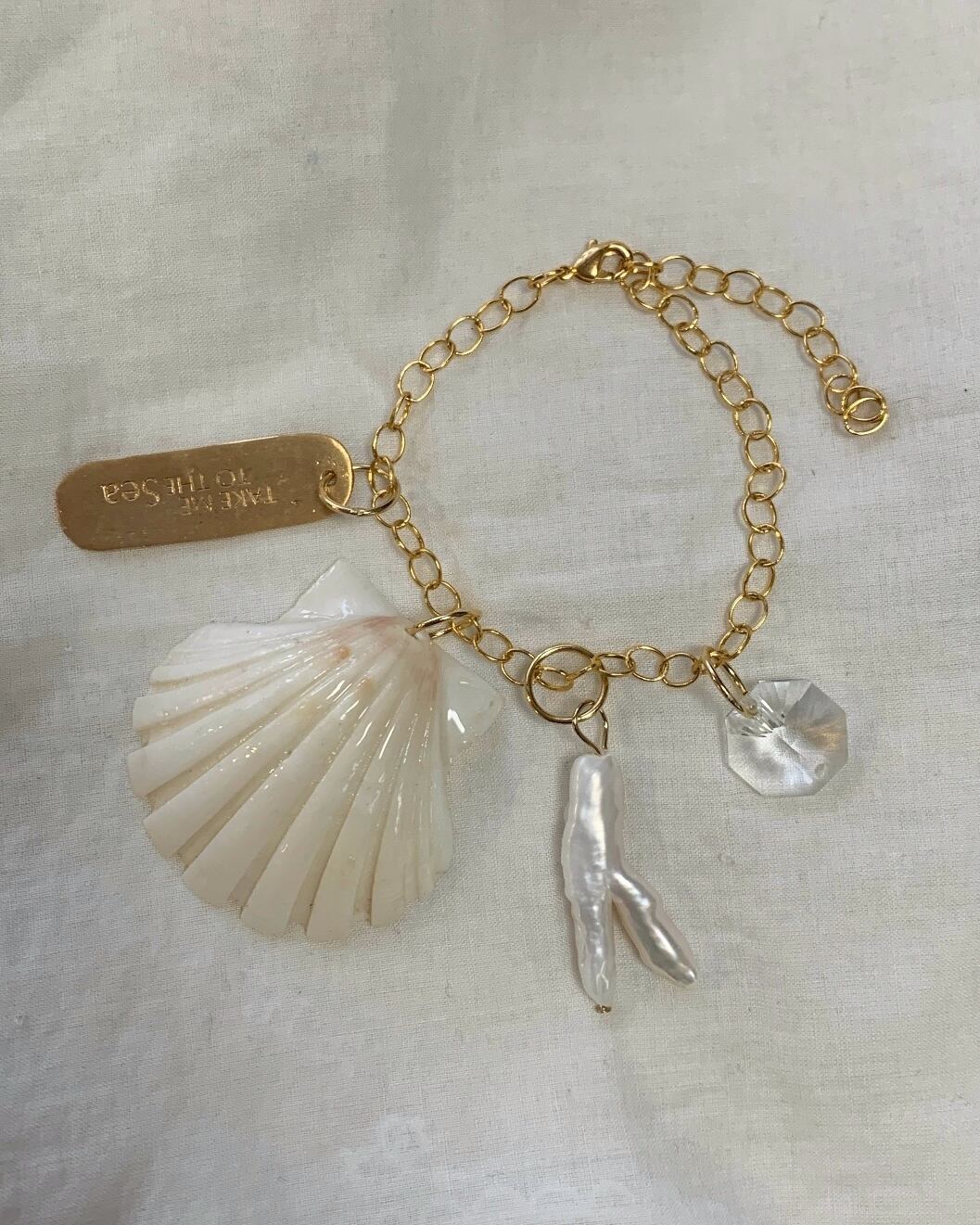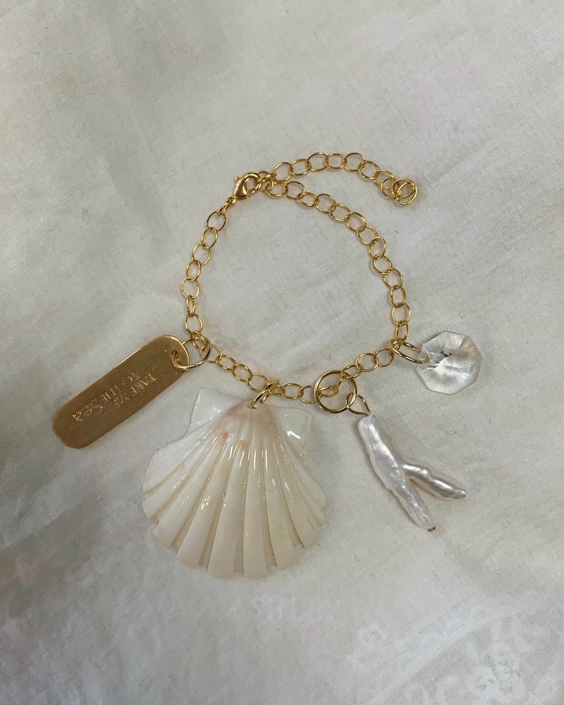 A one-of-a-kind keychain crafted from seashells, beads, pearls,