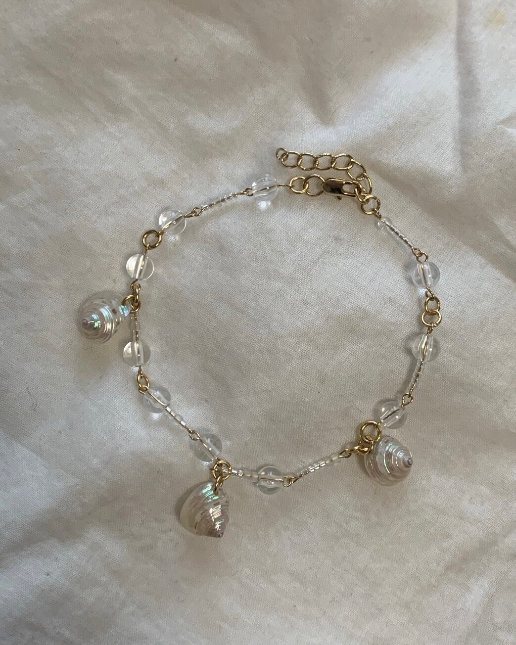 真珠層のある貝殻と、透明ビーズのビーズブレスレット。