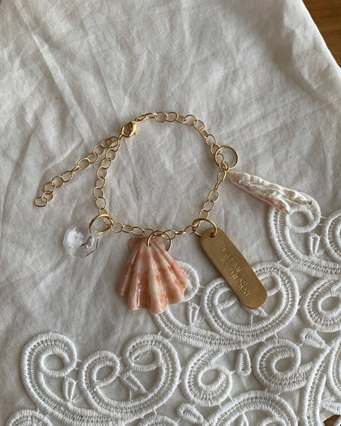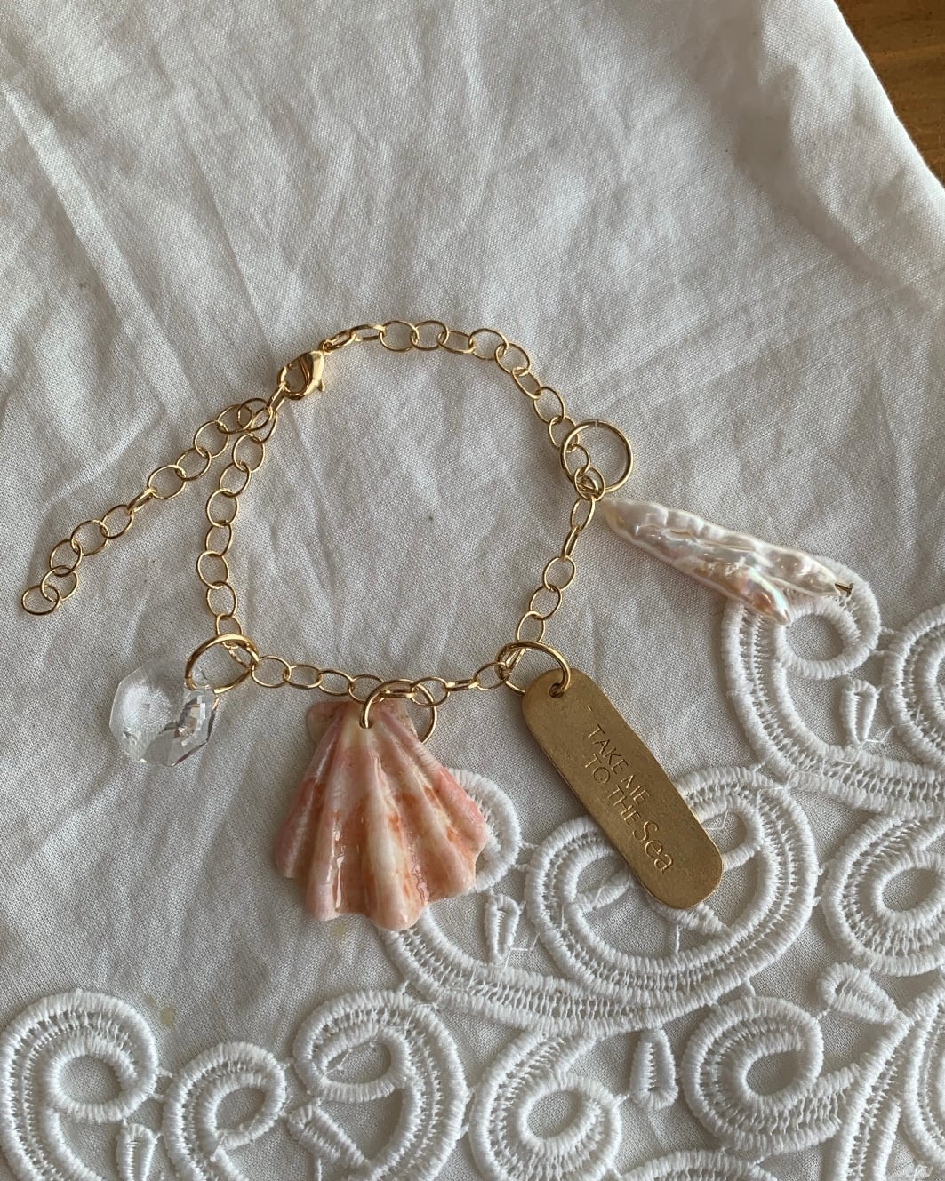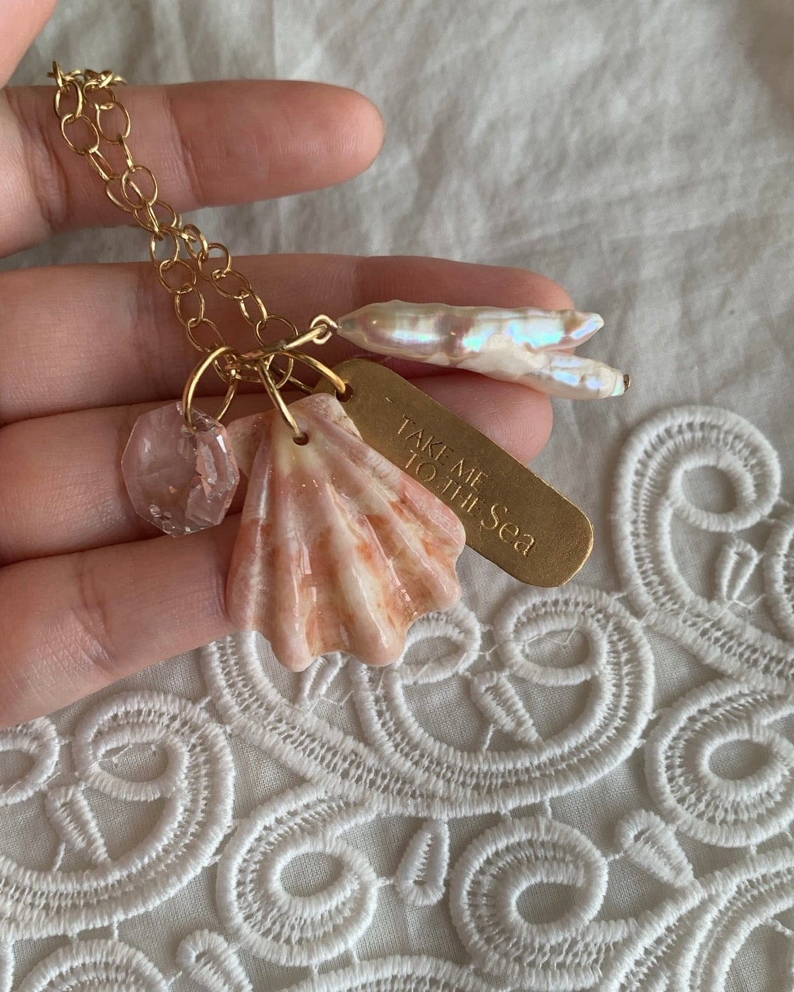 A one-of-a-kind keychain crafted from seashells, beads, pearls,