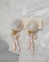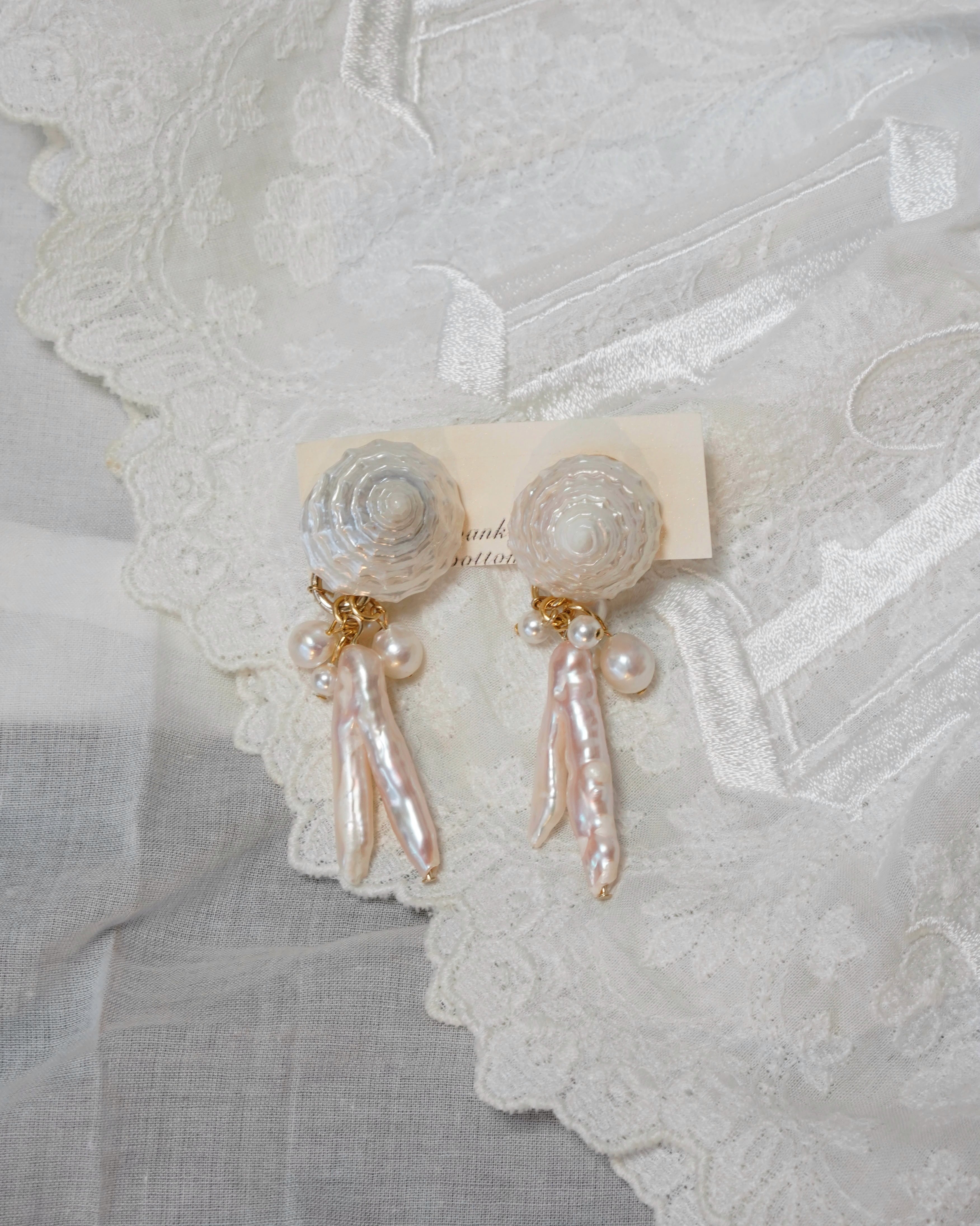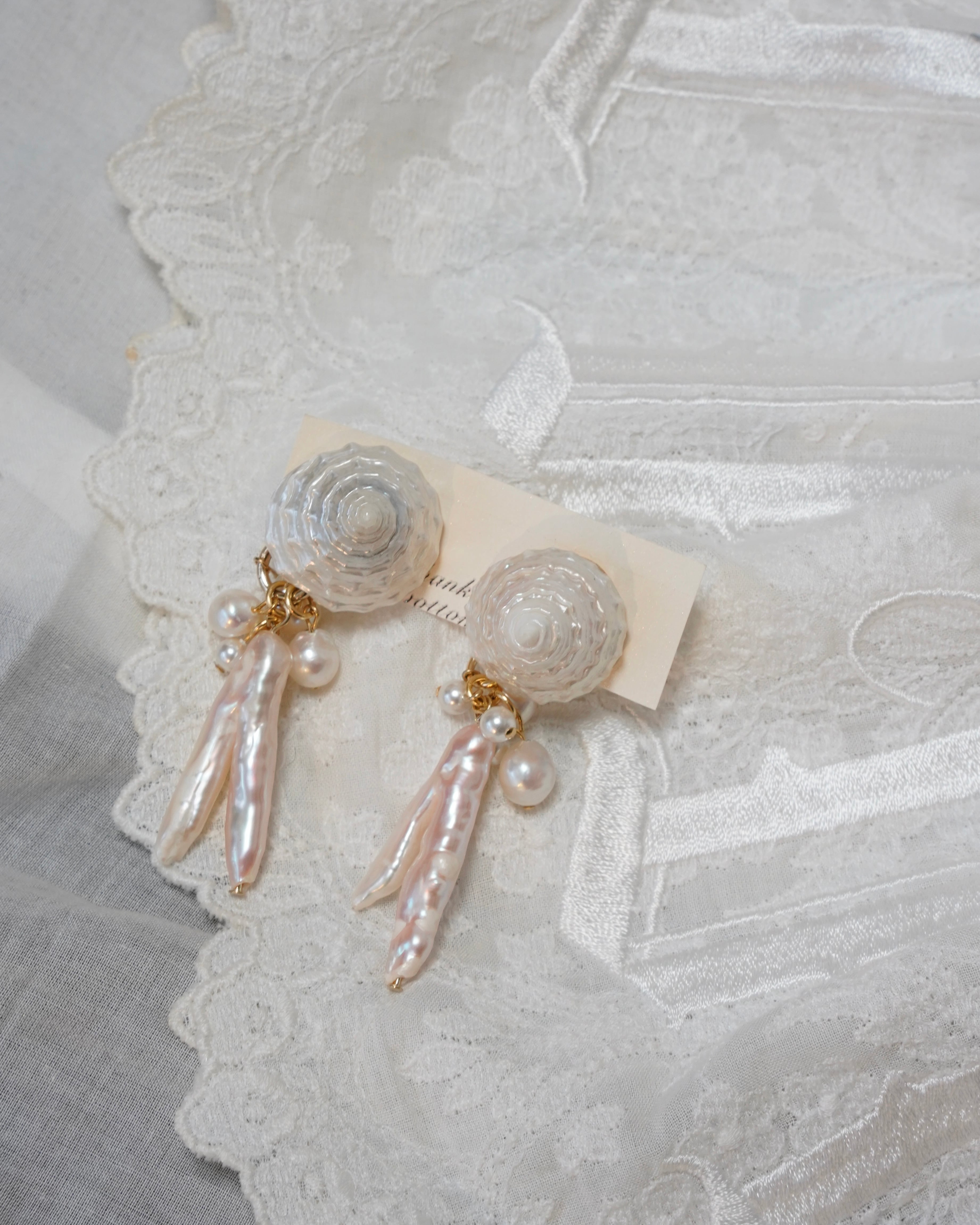 白い貝殻にビーズやパールを繋ぎ合わせたイヤリング