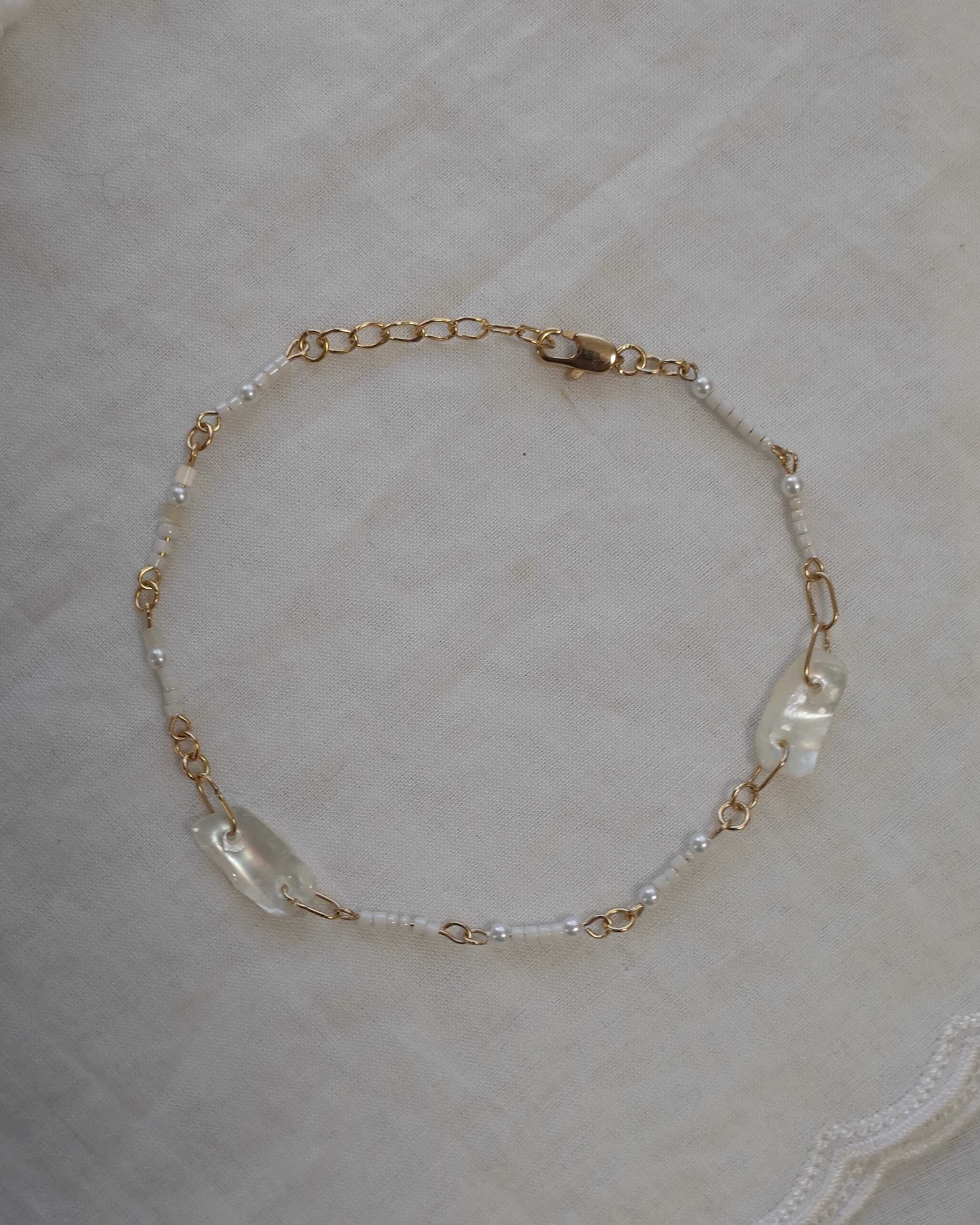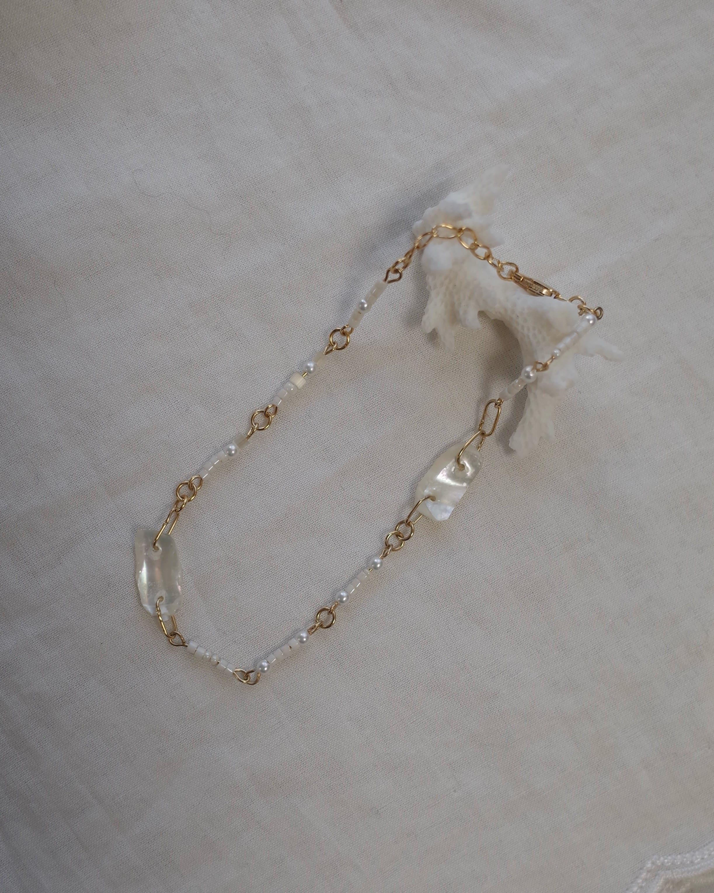 I drilled small holes into a seashell with a white aurora layer and linked it with beads.