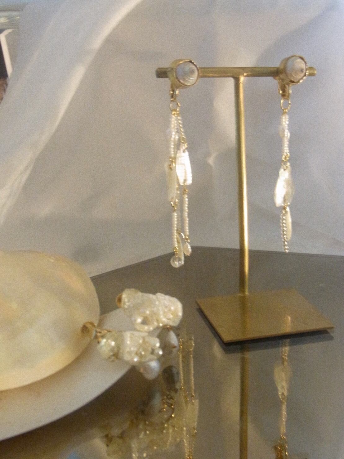 下はビーズ、貝殻、淡水パール、水晶を使用しています。